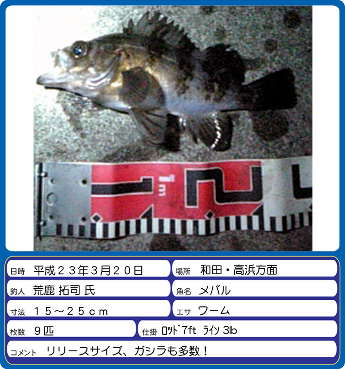 勢浜の地磯にて小浜市の細野裕氏がタケノコメバルの38.5cmをテキサスリグにて釣られました。他に20cm級のガシラも釣られたそうです。夕方には南川河口にてシーバスの50cm級も釣られたそうです。 |