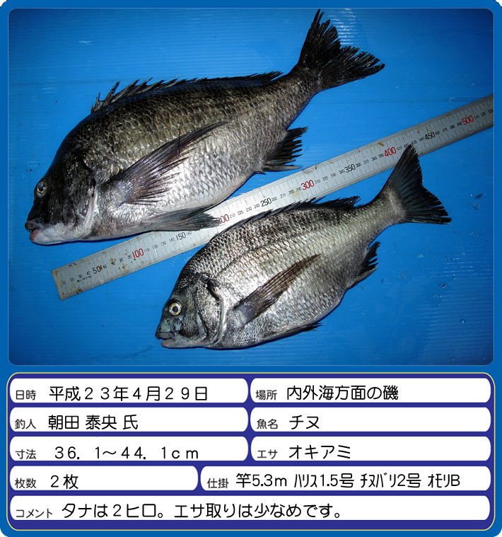 内外海方面の磯にて京都市の岩真一氏がチヌの37.6〜45.5cmを2枚釣られました。なぜかオキアミでキスが釣れたそうですが毎年必ず釣れるそうです。 |
