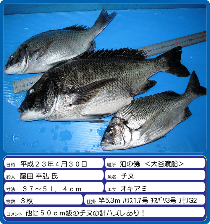 泊の磯にて小浜市の藤田幸弘氏がチヌの37〜51.4cmを3枚釣られました。さらにもう一枚50cm級のチヌを浮かせたのですがタモ入れ時に針が外れてしまったそうです。惜しいっ! |