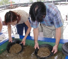そして、最後に「砂金コーナー」に行った私と田中先生、その砂金採りに挑戦しました。「採れるんですか?」と、言いながら水の底の土をすくった私。ザルの上にある土を回し揺すり・・・そんなことをしばらく繰り返していると・・・・「おう・・・!砂金だ!」と、ゴールドハンターになっていました(やったぁ〜!)。